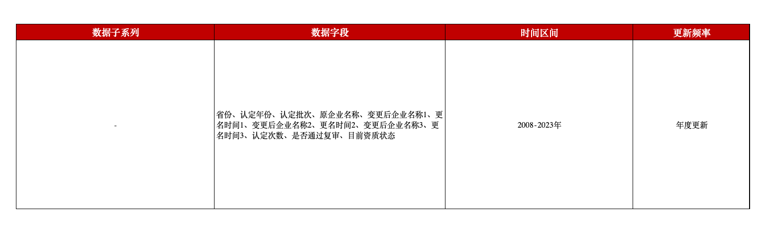 为支持相关领域研究,本平台团队推出中国高新技术企业名单数据,本数据涉及全国31个直辖市、省、自治区及5个计划单列市的高新技术企业,企业数量近37万家,并涵盖认定年份、批次、变更前后企业名称、更名时间、资质状态等字段。