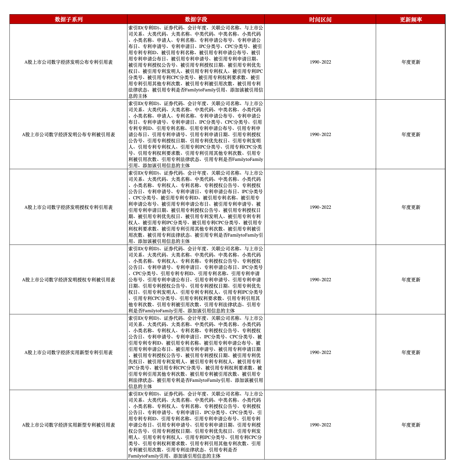 本平台依据上述标准为建库指导文件,与A股上市公司名单相匹配,提供了A股上市公司数字经济专利相关数据。本数据在结构上按照专利类型分为发明公布、发明授权、实用新型三部分,每部分各含引用表及被引用表,以展现各类型专利的引用被引情况,并与A股上市公司数字经济专利申请与授权数据相呼应,以期为学术界提供更优质、先进的数字经济专题数据支持。