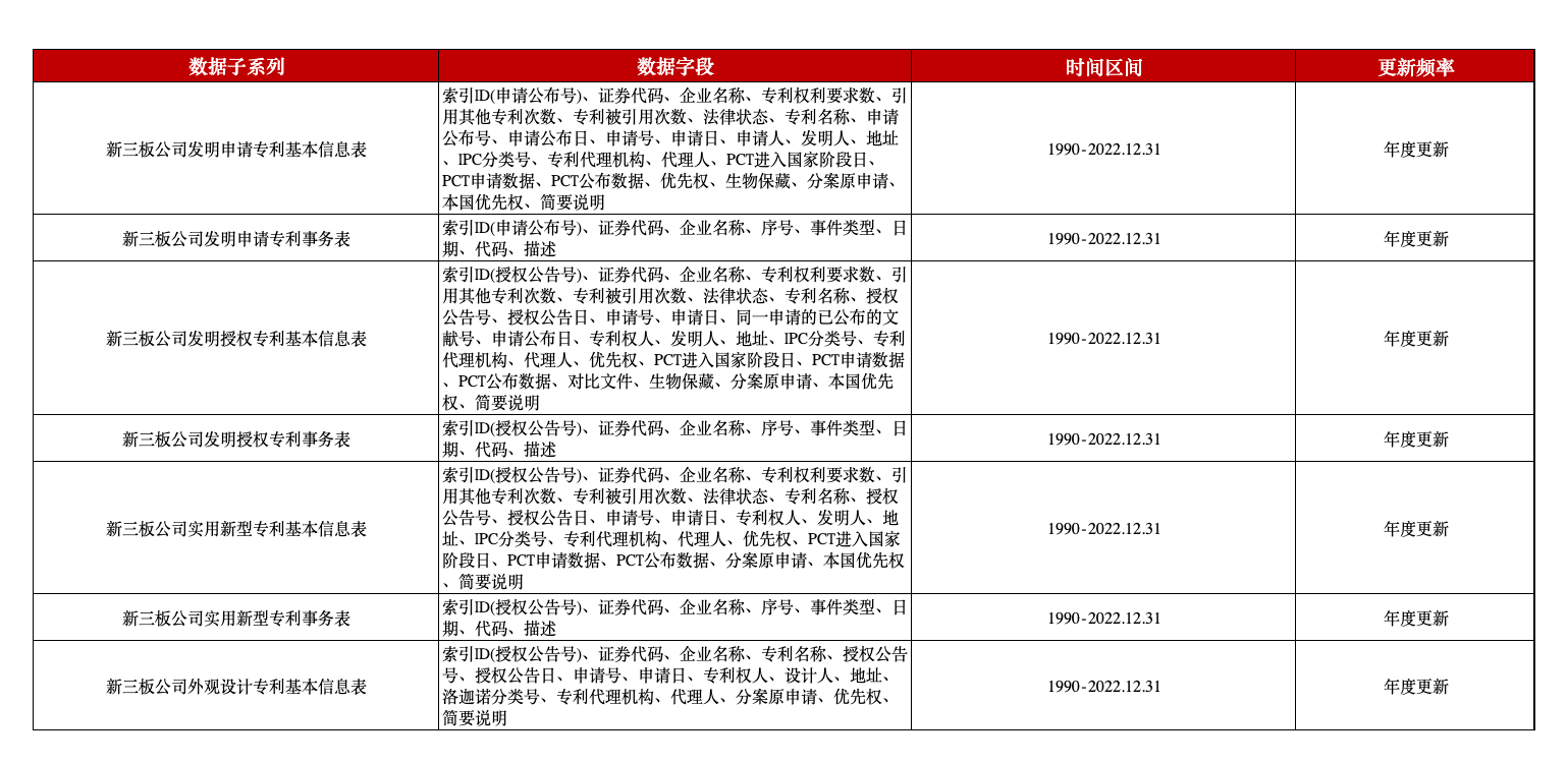 该网站专利系列数据已经覆盖到了上市公司、工业企业、高新技术企业、高校,本次新增新三板专利数据,分为发明申请专利、发明授权专利、实用新型专利、外观设计四部分,分设基本信息表和事务表(其中,外观设计无事务表) 。