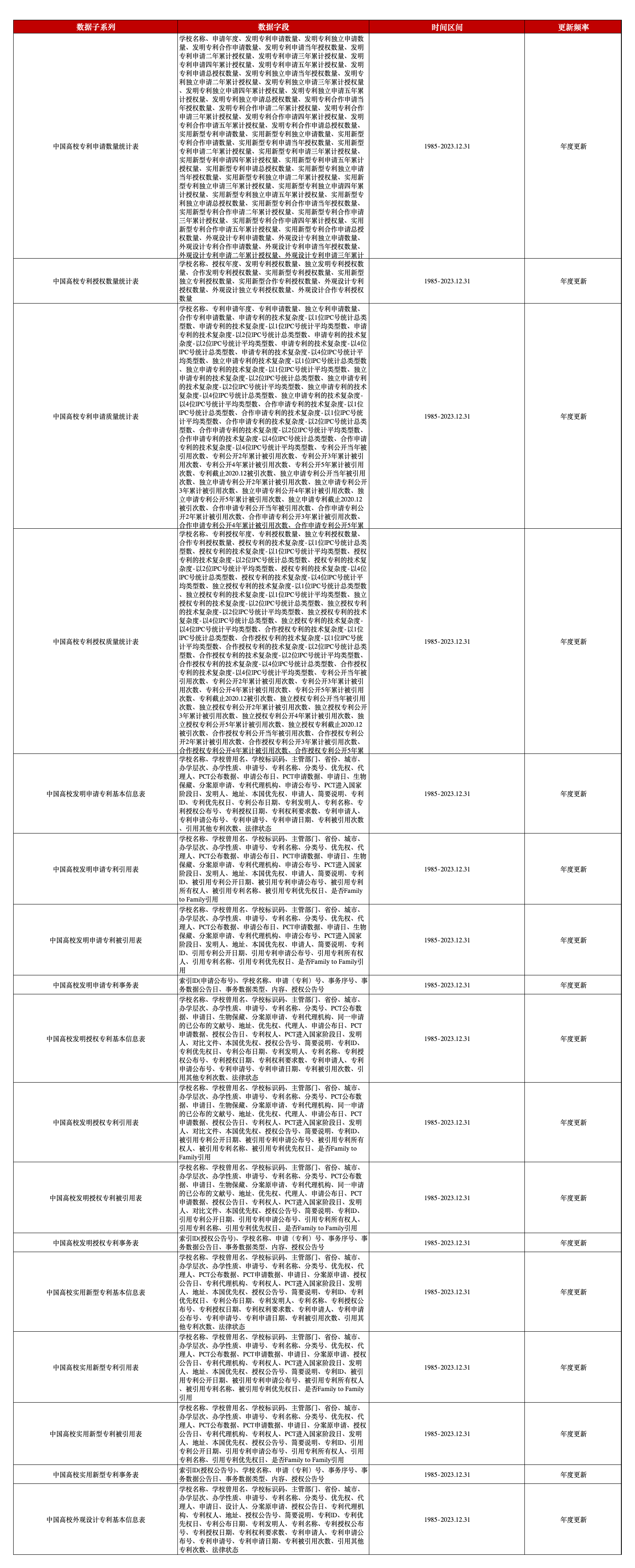 作为衡量高校科技创新成效的重要指标,专利统计数据和专利引用数据分别在数量和质量双方面给予数据支持。本平台高校专利数据包含专利统计、专利引用被引用两个部分,其中,专利统计数据分为数量统计表和质量统计表,这两类表分别以专利申请和专利授权为依据再进行划分,更进一步地,专利质量统计表还按专利类型细分为发明、实用新型、外观设计三模块。专利引用及被引信息在此数据中体现于专利详情表部分,与上市公司、工业企业等专利引用被引用数据相同,分发明申请、发明授权、实用新型、外观设计四模块,各模块包含基础信息表、引用表、被引用表、事务表四张表格(外观设计无引用表、被引表、事务表)。