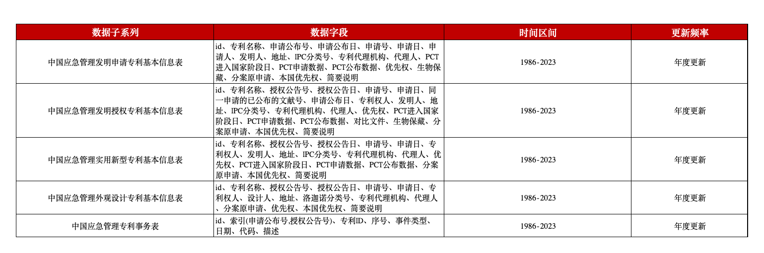 本平台整理了我国应急管理专利的基本信息及事务信息,并根据专利的四个类型分表列示,为相关研究助力。