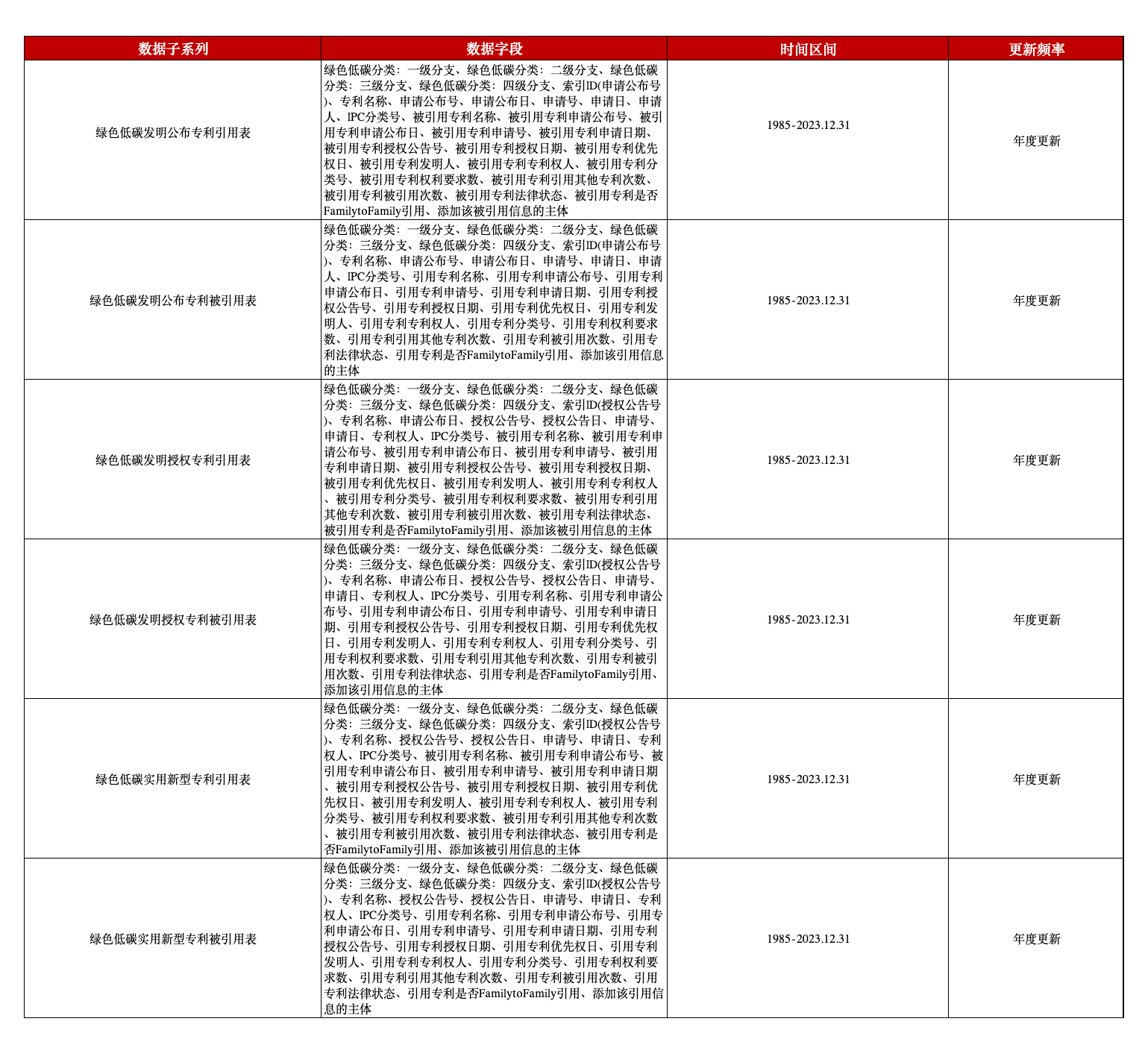 本平台数据团队推出的中国绿色低碳专利引用及被引用数据以国际专利分类体系为基础,分为发明公布专利、发明授权专利、实用新型专利三部分,分设专利引用表和专利被引用表。