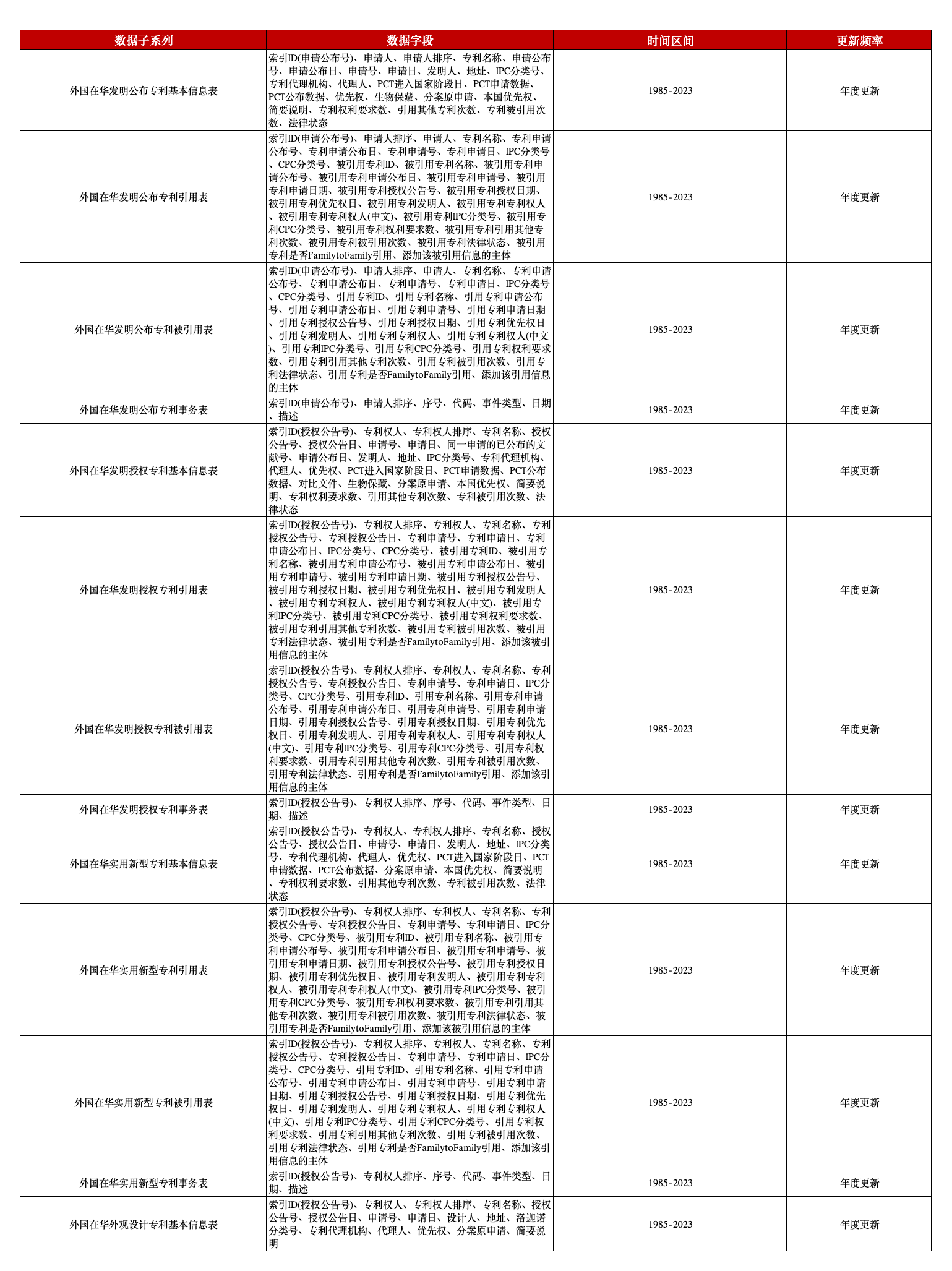 本平台推出的外国在华专利引用及被引用数据,在结构上按照专利类型分为发明公布、发明授权、实用新型、外观设计四部分,每部分各含基本信息表、引用表、被引用表和事务表(外观设计只有基本信息表),以展现外国来华申请和授权专利情况,以期为学术界提供更优质、先进的外国在华专利相关数据支持。